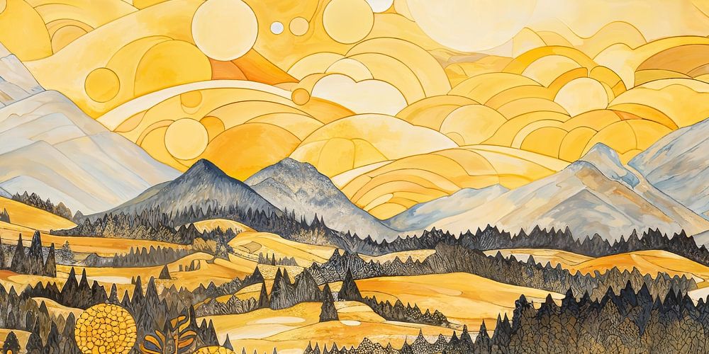 Een krachtig en warm berglandschap wordt op een abstracte manier weergegeven in dit werk. De compositie wordt gedomineerd door gelaagde bergtoppen in een palet van gele tinten. De zichtbare, rijke textuur geeft het beeld diepte en een expressief karakter. Het is een indrukwekkende en sfeervolle blikvanger, ideaal om een gevoel van natuurlijke kracht en warmte aan een interieur toe te voegen.