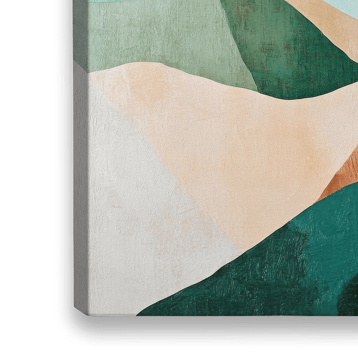 Zachte heuvels in harmonieuze groene tinten en warme aardetinten ontvouwen een rustgevend landschap. De zachte overgangen creëren een sfeer van ontspanning en sereniteit. Dit kunstwerk is ideaal voor de slaapkamer of woonkamer en nodigt je uit om het leven van alledag achter je te laten en je onder te dompelen in vredige rust.