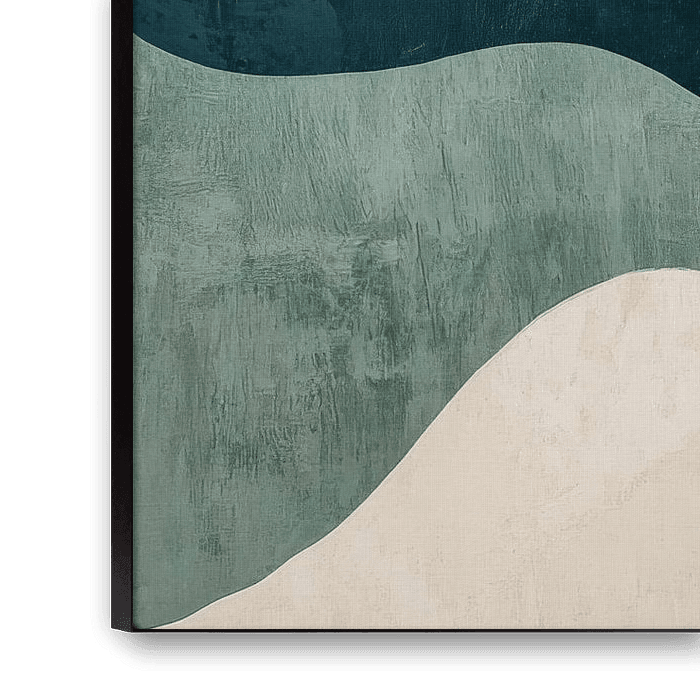 Zachte heuvels in rustgevende blauwe en aardse tinten creëren een harmonieus landschap dat uitnodigt om te dromen. De vloeiende vormen doen denken aan een ontspannen wandeling door de natuur. Ideaal voor de slaapkamer, het creëert een kalme sfeer die ontspanning en welzijn bevordert. Een perfecte blikvanger voor rustige momenten.