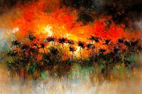 Dit unieke ontwerp vangt de essentie van een bloemenveld bij zonsondergang. De expressieve penseelstreken en levendige kleuren geven het kunstwerk een dynamische en energieke uitstraling. De bloemen lijken te dansen in het warme, gloeiende licht van de ondergaande zon. Het contrast tussen de warme tinten en donkere accenten voegt diepte en drama toe aan het geheel. Ideaal als opvallend stuk wanddecoratie voor een woonkamer of eetkamer, dit schilderij brengt leven en warmte in iedere ruimte. Een perfecte keuze voor liefhebbers van abstracte kunst en kleurrijke ontwerpen.