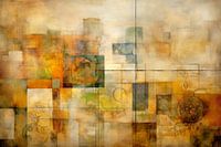 Een harmonieus spel van rechthoeken en lijnen in warme oker- en groentinten. Het schilderij ademt rust en structuur, met subtiele details die uitnodigen tot steeds opnieuw kijken.