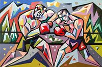 Dit unieke abstracte schilderij combineert de intensiteit van een bokswedstrijd met de rust van een berglandschap. In een kubistische stijl worden twee krachtige figuren met grote bokshandschoenen weergegeven, omringd door scherpe vormen en levendige kleuren. De geometrische vormen en felle tinten zoals rood, blauw en groen geven het…