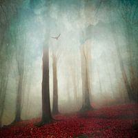 Een mistig boslandschap met torenhoge bomen en een helderrood bladertapijt. Een eenzame vogel glijdt sierlijk door de mistige lucht.