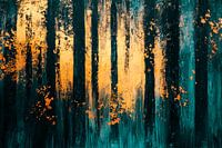 Een betoverend ontwerp dat de magie van een abstract boslandschap vangt. Het spel van gouden licht dat door de diepe tinten blauw en groen breekt, creëert een sfeervolle en dynamische uitstraling. Perfect voor liefhebbers van moderne kunst, brengt dit stuk elegantie en diepte in elke ruimte. Een echte blikvanger, ideaal voor een slaapkamer of hal om een rustieke maar hedendaagse sfeer te creëren.