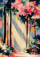 Dit abstracte schilderij ensceneert een boslandschap met krachtige, expressieve penseelstreken en een intens kleurenpalet. Een diagonaal, licht pad in crèmekleurige en gele tinten leidt de blik naar het midden, geflankeerd door bomen met opvallende zwarte stammen. Het gebladerte explodeert in tinten roze, rood, blauw en groen, terwijl…