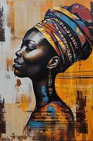 Deze levendige en kleurrijke afbeelding toont een prachtig portret van een vrouw van kleur met een gedetailleerde en opvallende hoofddoek. De schilderstijl combineert realisme met abstracte elementen, waarbij de huidtinten in verschillende felle kleuren zijn weergegeven, wat een dynamisch en expressief effect creëert. De hoofddoek is versierd met een complex patroon van geometrische vormen en heldere kleuren, wat een gevoel van cultuur en identiteit oproept. De achtergrond is een mix van warme tinten met abstracte penseelstreken, die de aandacht naar het gezicht en de hoofddoek trekken.