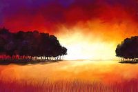 Digitaal acrylschilderij van een minimalistische landschap in rood, paars en geel. Geschilderd in een abstract-expressieve stijl met zichtbare sporen van schildersmessen.