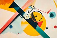 Het momentum van beweging is gevangen in een fascinerend samenspel van kleuren en vormen. Geometrische elementen ontmoeten dynamische lijnen, terwijl het gestileerde fietsframe opvalt in krachtig zwart. Fel geel en rood fungeren als de hartslag van de rit, terwijl zachte, subtiele tinten een harmonieuze diepte creëren - een ode aan het fietsen in abstracte vorm.