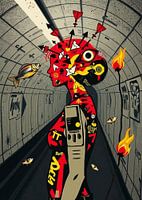 Een abstract figuur staat in een metrotunnel, weergegeven in een gestileerde, grafische kunststijl. De figuur is overwegend rood met zwarte en gele accenten, versierd met pijlen en symbolen. De figuur houdt een retro-apparaat vast. Links zweeft een vis in de lucht en rechts staan fakkels met vlammen. De metrotunnel heeft grijze muren…