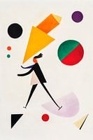 Een dynamische figuur in gestileerde beweging, wiens hoofd is versierd met een felgele kegel, zorgt voor opwinding. Omringd door levendige geometrische vormen en heldere kleuren ontvouwt zich een harmonieuze compositie. De zwarte en kleurrijke elementen dansen in de picturale ruimte en geven de scène een speelse, bijna droomachtige sfeer.