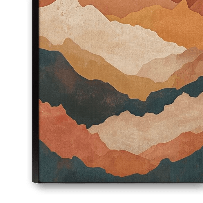 Deze fascinerende abstracte kunstdruk, getiteld "Desert Hues," toont een prachtig gelaagd berglandschap weergegeven in een rijk palet van aardetinten en warme kleuren. Tinten van terracotta, roest, verbrand oranje, oker, crème en diep groenblauw lopen naadloos in elkaar over en creëren een gevoel van diepte en rust. Het minimalistische ontwerp en de organische vormen roepen de vredige grandeur op van woestijnlandschappen en glooiende heuvels. Perfect om een vleugje modern bohemien, mid-century modern of rustieke charme toe te voegen aan elke woonruimte, brengt dit unieke stuk warmte en een verfijnde natuurlijke esthetiek in je huis of kantoor. Het is een ideale keuze voor wie op zoek is naar een sereen en stijlvol middelpunt dat past bij verschillende interieurthema's.