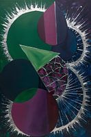 Dit kunstwerk combineert heldere geometrische vormen met een gedurfd kleurenpalet van groen, paars en zilver. De contrasterende cirkels, driehoeken en polygonen overlappen elkaar op een intrigerende manier, waardoor diepte en dynamiek ontstaan. Het zilveren accent in het werk geeft een glinsterende, bijna kosmische uitstraling die…