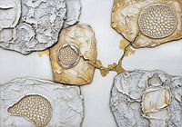 Gestructureerde abstracte kunst met ingebedde gouden bloempatronen in gelaagde, gebarsten vormen in gebroken witte en bruine tinten tegen een helderwitte achtergrond.