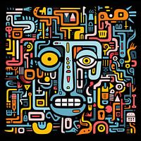 Een kleurrijke en abstracte illustratie van een gezicht dat bestaat uit een doolhof van lijnen en vormen in verschillende kleuren. De afbeelding heeft een zwarte achtergrond en een futuristisch of technologisch gevoel.