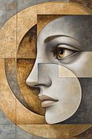 Op de muur prijkt een kunstwerk dat je blik trekt met zijn bijzondere uitstraling. Het toont een abstract gezicht in goud en grijs, waarbij de lijnen en vormen speels met elkaar dansen. Het gezicht kijkt naar links, alsof het in gedachten verzonken is of het een geheim overdenkt. De kleuren geven een moderne flair aan de kunst, waarbij de goud- en grijstinten elkaar aanvullen en in balans zijn. De abstractie maakt dat je eigen interpretatie en fantasie een rol spelen, terwijl het gouden glans de eenvoud en het mysterie van het gezicht benadrukt. Dit kunstwerk brengt een eigentijdse sfeer en een vleugje intrige in elke ruimte.