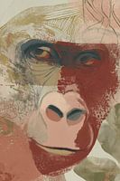 Expressief gorillaportret met soulvolle ogen, weergegeven in warme terracotta-, salie-, stoffig blauwe en crèmekleurige tinten. Gelaagde abstracte penseelstreken met subtiele gouden accenten creëren diepte en emotie.