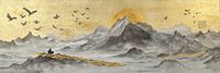 Veel kraanvogels zweven boven een landschap van bergen, neergezet in fijne Chinese inkt op zacht, wit rijstpapier. De lijnen van de bergen golven als een rustige rivier, kronkelend door een vredig panorama. Tussen de inktlijnen stralen gouden accenten, alsof de bergen net door de zon worden gekust. Deze subtiele elegantie nodigt uit tot rust en reflectie, een vleugje oosterse eenvoud en schoonheid. De combinatie van donkere inkt en warm goud laat het geheel tot leven komen, als een dans van licht en schaduw, perfect voor wie op zoek is naar evenwicht en harmonie in hun omgeving.