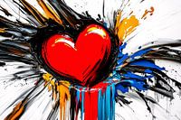 Dit prachtige kunstwerk combineert de krachtige uitstraling van een felrood hart met een explosie van dynamische verfspatten in zwart, wit, geel en blauw. De contrasterende kleuren en energieke lijnen creëren een moderne en expressieve sfeer. Ideaal als wanddecoratie voor een ruimte die een artistieke en levendige touch nodig heeft.…