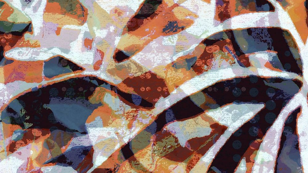 Een abstracte impressie van herfstachtige gedachten in terracotta, bruin, groen, roze en wit. Format: liggend. Stijl: graphics.
