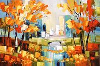 Dit levendige ontwerp brengt de warmte en schoonheid van de herfst naar binnen met een kleurrijk abstract landschap. Heldere oranje en gele bladeren contrasteren prachtig met koele blauwe en groene tinten, wat een dynamisch en modern gevoel geeft. Perfect als eyecatcher voor een woonkamer of eetkamer, dit schilderij creëert een unieke…