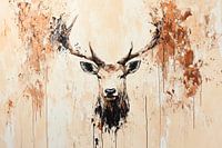 Dit kunstwerk toont de imposante schoonheid van een hert, weergegeven in een abstracte stijl. Het gewei van het dier lijkt haast op te gaan in de achtergrond, waarbij druppelende verf en grove penseelstreken zorgen voor een dynamisch en expressief effect. De neutrale kleuren, zoals beige, bruin en zwart, zorgen voor een rustig geheel…