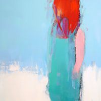 Abstract "het meisje met het rode haar", Abstract portret van een meisje met rood haar en een blauwe jurk tegen een blauw witte achtergrond.