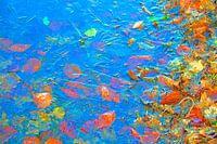 Herfstblad onder ijs verborgen, in vrije bewerking