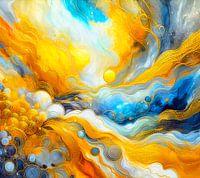 Een illustratie in aarde kleuren, goud en blauw gecreëerd met A. I. en digitaal bewerkt. Impressie van de aarde en hemellichamen . het is een beetje in de stijl van Gustav Klimt met zijn ronde vormen en goud. De zon schijnt door de wolken en geeft een gouden glans . Het is een beetje sprookjesachtig.