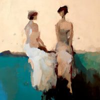 Abstract in aardetinten: "vriendinnen". Twee vrouwen in lange, elegante jurken zitten bij elkaar op een muurtje te praten zoals alleen zij dat kunnen. Echte vriendschap is elkaar onvoorwaardelijk steunen en elkaar écht zien en horen.