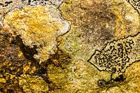 Op de foto is een deel te zien van een kei in de grond met een grootte van ongeveer een meter. Door een close-up te fotograferen ontstaan mooie abstracte composities. Aan de foto is verder niets bewerkt. de kleuren zitten in de steen; de zwarte puntjes komen van begroeiing.