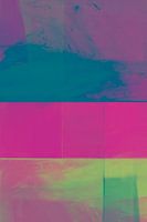 Abstract schilderij in felle kleuren: roze, geel, groen en blauw. Door te werken met verschillende lagen, ontstaat er een spannend geheel.