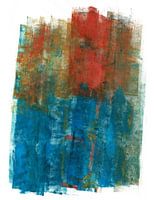 Met een verfroller aangebrachte acrylverf in warme rood- en okerkleuren en koele blauwtinten komen samen in dit levendige en dynamische abstracte werk met veel textuur en contrast.