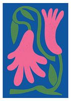 Abstracte weergave van roze bloemen tegen een blauwe achtergrond. Hippe illustratie.