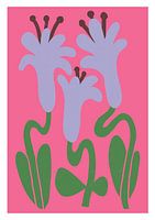 Abstracte illustratie van lila bloemen tegen een knalroze achtergrond. Modern.