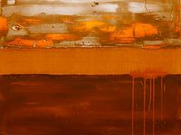 Het schilderij is opgebouwd uit drie horizontale vlakken. De onderkant is een diep, mat chocoladebruin. De midden zone is een uniek vlak met een zichtbare canvas- of weefseltextuur in een warme okergele/oranjebruine kleur. De bovenste laag combineert ruwe streken in metallic goud/koper en gedempte oker/olijf-tinten.