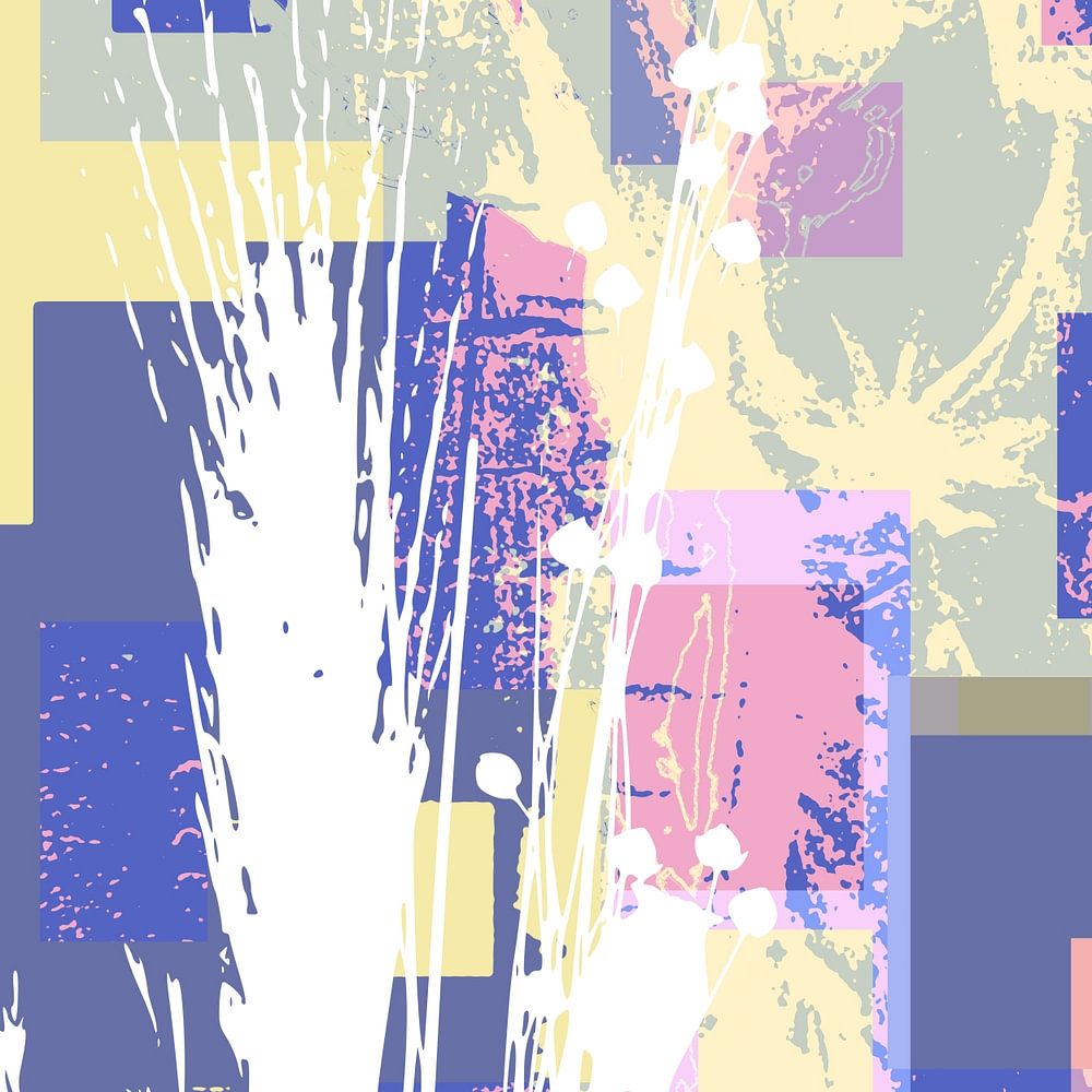 Abstract kleurig kunstwerk met lila, paar, geel en wit.