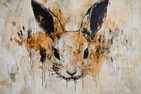 Dit schilderij toont een konijn op een speelse, abstracte manier. De combinatie van aardetinten, zwart en goud zorgt voor een dynamische en opvallende uitstraling. De textuur van de verf, met druipende lijnen en vlekken, geeft het geheel een levendig karakter. Het konijn lijkt haast te verschijnen uit een abstracte wereld, met een mix…