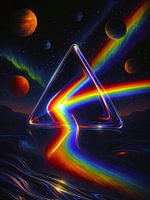 Het prisma wordt omringd door fantasierijke planeten in rode, blauwe en groene tinten, ingebed in een sterrenhemel met gloeiende aurora's en wervelende nevels.