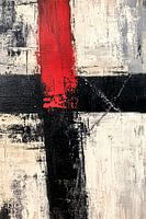 Dit dynamische schilderij combineert krachtige kleuren en vormen op een unieke manier. Het kruis in zwart en rood springt direct in het oog, terwijl de texturen en ruwe penseelstreken het kunstwerk een industriële en moderne uitstraling geven. Dit ontwerp past perfect in moderne en minimalistische interieurs waar contrast en abstractie centraal staan. Het werk straalt energie en kracht uit, ideaal om een statement te maken in bijvoorbeeld een hal of woonkamer. Dankzij de monochrome achtergrond met subtiele beige en grijstinten, voegt het schilderij zowel rust als dynamiek toe aan elke ruimte. Laat dit abstracte meesterwerk je interieur een gedurfde, artistieke touch geven.