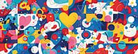 Abstract kunst | Vrolijke harten en cirkels - In dit abstract schilderij zie je vrolijke kleuren en verschillende vormen, met opvallende elementen zoals harten en cirkels die samen een speelse en levendige compositie vormen.