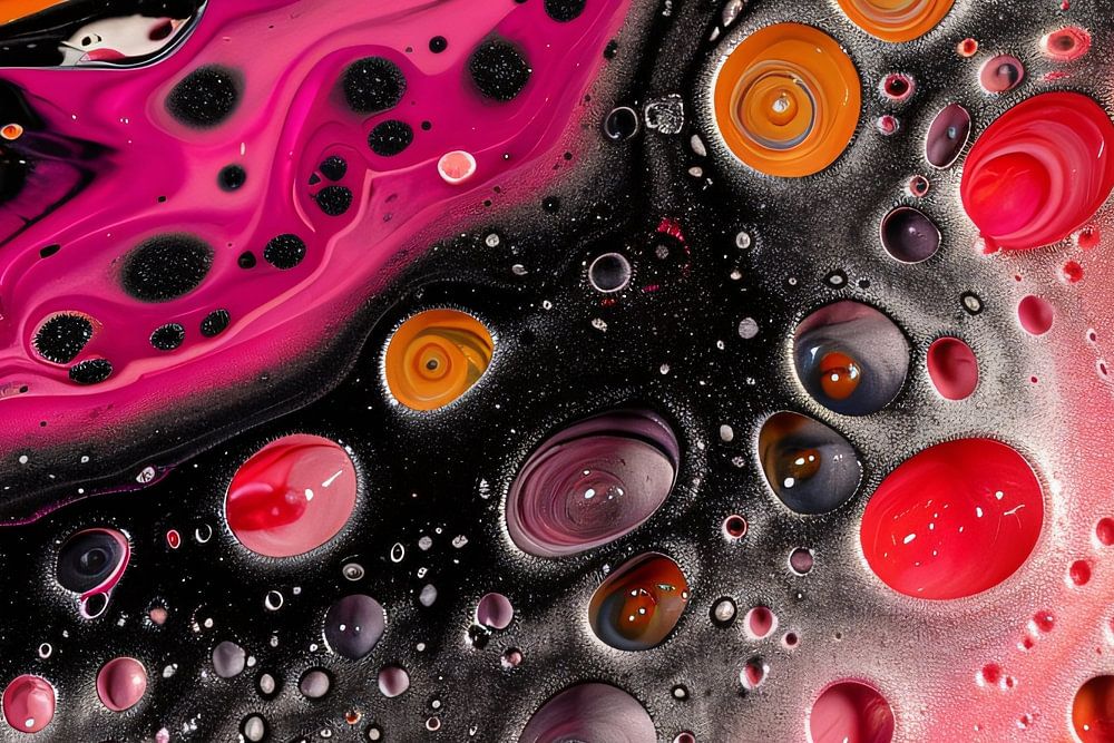 Dit levendige en dynamische ontwerp brengt een explosie van kleuren en vormen samen in een visueel spektakel. De levendige tinten zwart, roze, rood, oranje en wit creëren een betoverende abstracte compositie die de aandacht trekt en de verbeelding prikkelt. Dit kunstwerk is perfect voor moderne interieurs, vooral in slaapkamers en eetkamers, waar het een vleugje energie en creativiteit toevoegt. De combinatie van bellen en kleuren zorgt voor een speelse maar toch elegante uitstraling. Dit stuk is ideaal voor liefhebbers van moderne kunst en abstract expressionisme, en zal zeker een opvallende toevoeging zijn aan elke kunstcollectie of woonruimte.