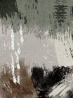 Modern abstract kunstwerk met fijne penseelstreken en zachte texturen in aardkleuren groen, zwart, bruin en beige en een vleugje wit.