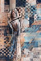 Een abstract kunstwerk van een vrouw met jurk. Een houtskool tekening van een gesture / pose van een vrouw - in gekleurd met digitale tekentechnieken. Veel contrast met donkerblauw op oranje en grijs tinten.