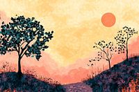 Dit schilderij straalt een serene en dromerige sfeer uit, perfect voor het verfraaien van elke ruimte. Het toont een kleurrijk landschap met glooiende heuvels, silhouetten van bomen en een opkomende zon die de lucht vult met warme tinten geel en oranje. De abstracte stijl en de gedetailleerde texturen creëren een harmonieuze balans…
