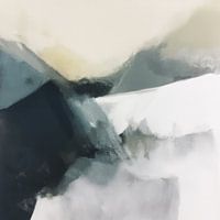 Abstract landschap in aardetinten. Verschillende tinten wit, beige, zwart, blauw en groen maken samen een abstract berglandschap.