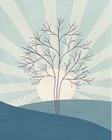 Abstract landschap met een boom tussen heuvels en de opgaande zon op de achtergrond in retro style met zichtbare zonnestralen.