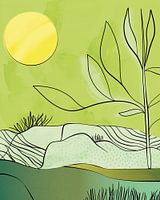 Abstract landschap in variaties van groen en geel, met grafische elementen in zwart: Een gestileerde boom tussen velden en heuvels met de zon op de achtergrond. De lente-groene lucht staat voor het geheel aan planten en bomen dat na een lange winter eindelijk weer groeit en groent.