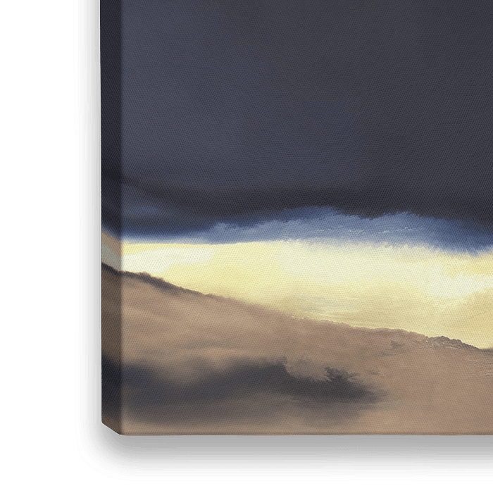 Abstract landschap in marineblauw en okergeel zonsondergang aan de horizon.