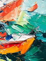 Dit kleurrijke schilderij toont een levendig tafereel met accenten van oranje, groen en blauw. De ruwe, dynamische penseelstreken wekken de indruk van een abstract landschap in beweging. De intense kleuren stralen energie en frisheid uit en maken dit werk ideaal voor kamers die een levendig en creatief accent nodig hebben.