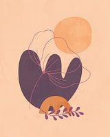 Abstract landschap met een grote bloem, een tak met kleine bladeren, en zon en twee organische vormen. De kleuren - variaties van oranje en paars - zijn geïnspireerd door een zonsondergang. De bloem en de tak zijn met inkt getekend, de rest van de illustratie is met aquarelverf geschilderd met een zichtbare textuur.
